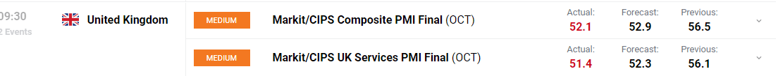 Sterling received a knock-back earlier in the session when the final Markit PMIs showed that the UK service sector recovery slowed sharply in October. The data revealed that the UK service sector was close to stalling even before the announcement of lockdown 2.0 in England. According to Tim Moore at IHS Markit, ‘November’s lockdown in England and a worsening Covid-19 situation across the rest of Europe means that the UK economy seems on course for a double-dip recession this winter and a far more challenging path to recovery in 2021’.